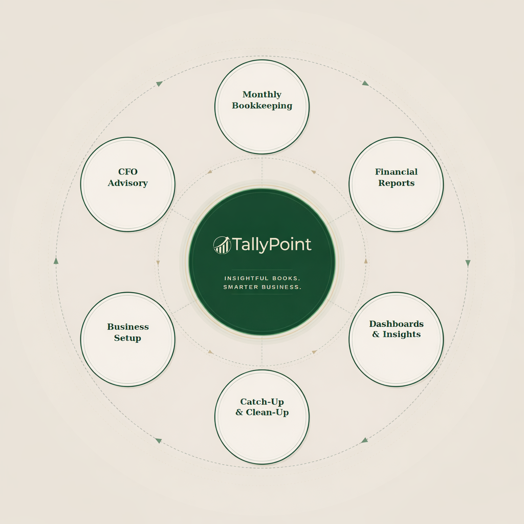 Every service TallyPoint offers starts with a foundation of clean, accurate books — and builds toward the financial clarity that helps you make better business decisions. Whether you need to get caught up, stay current, or go deeper with CFO-level strategy — we've got you covered.